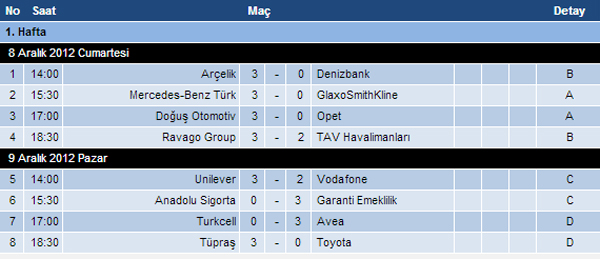 8 Aralık Cumartesi günü Arçelik-Denizbank müsabakasıyla başlayan Fonex Şirketler Voleybol Ligi 2012-2013 sezonunun ilk gününde 4 müsabaka oynandı. 1.Hafta karşılaşmaları 9 Aralık Pazar günü oynanan müsabakalarla sona erdi.