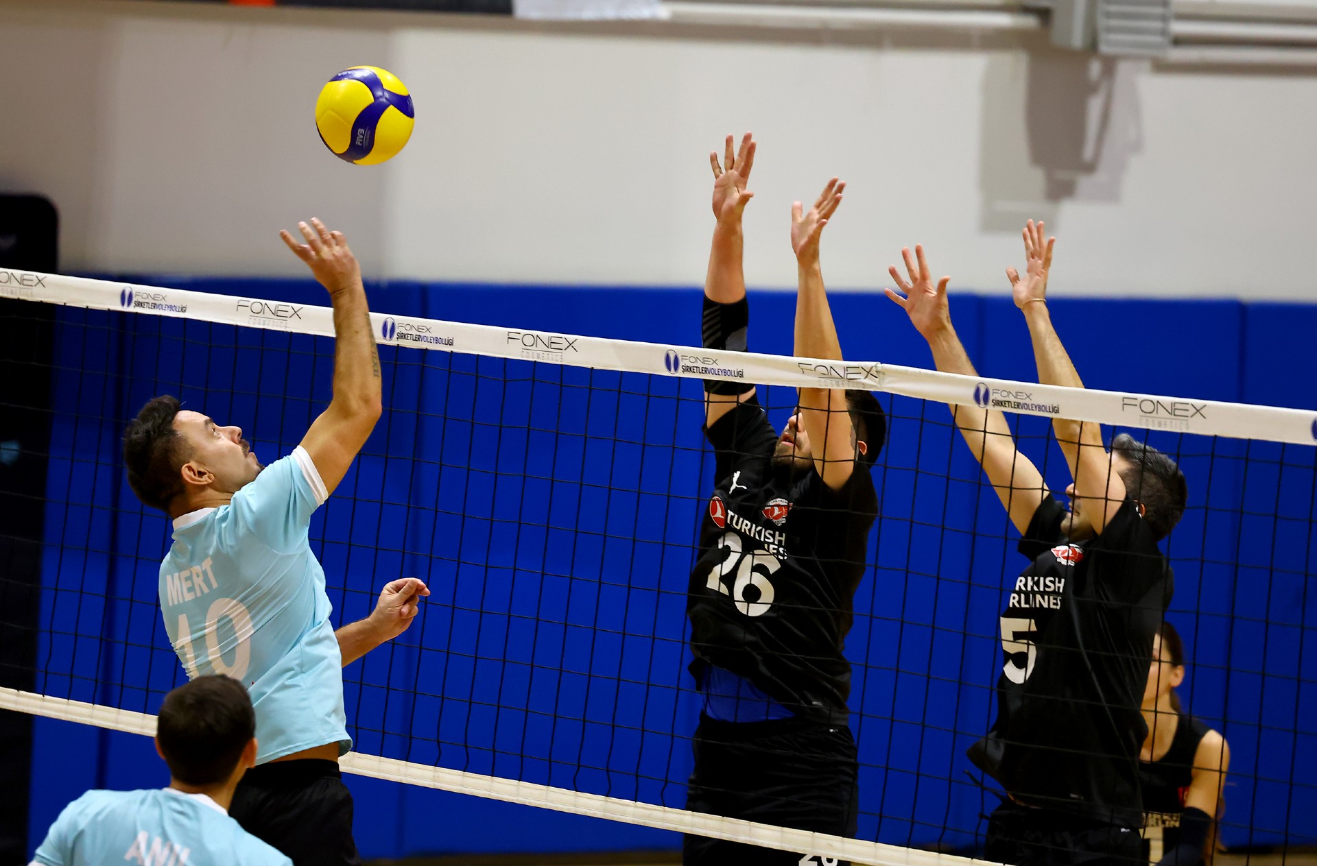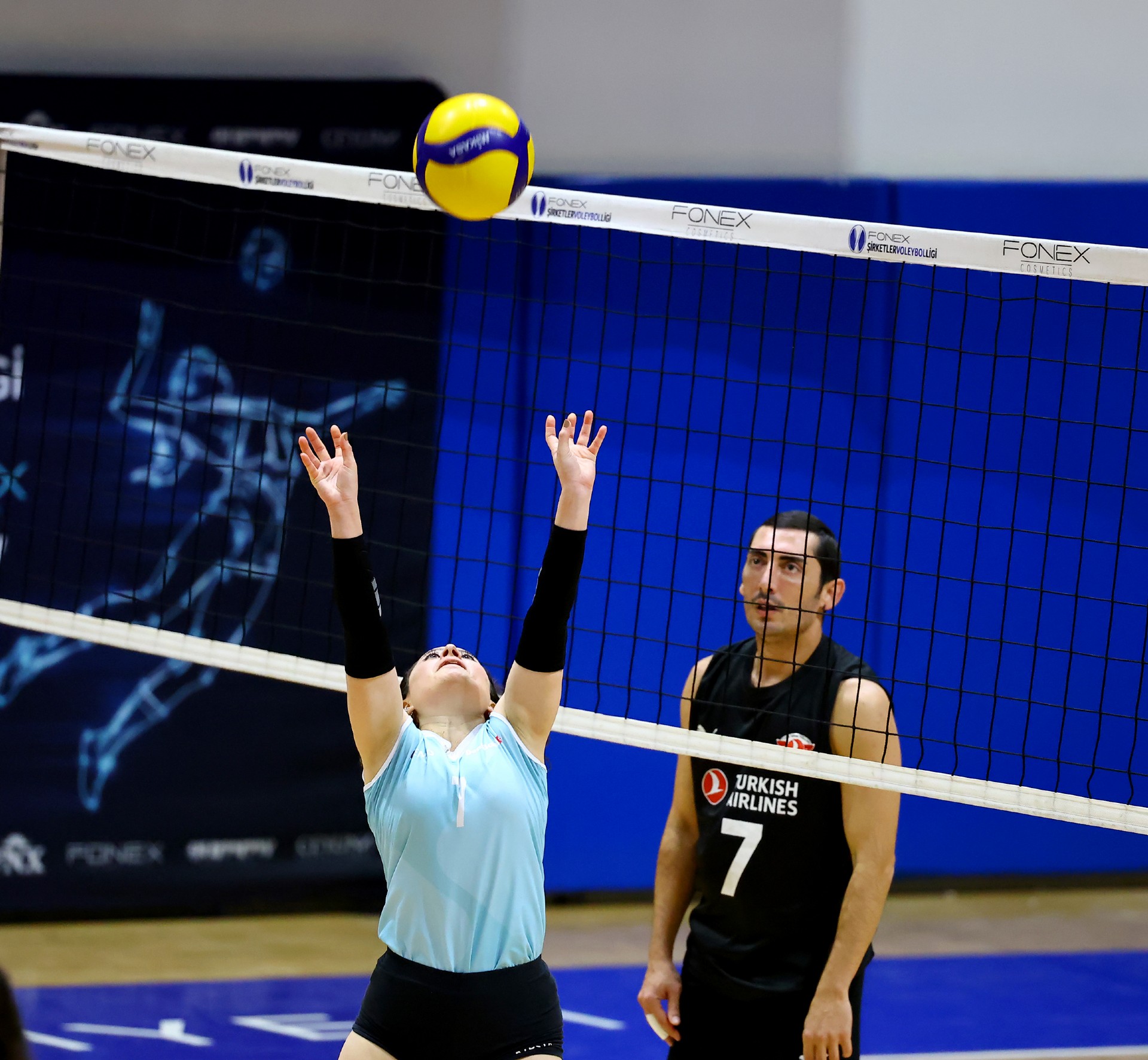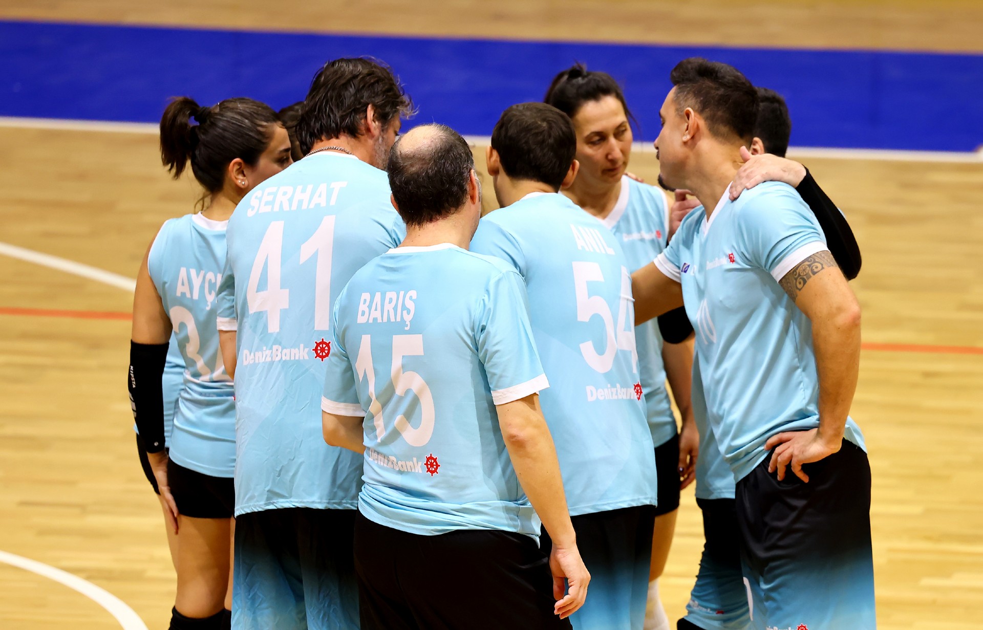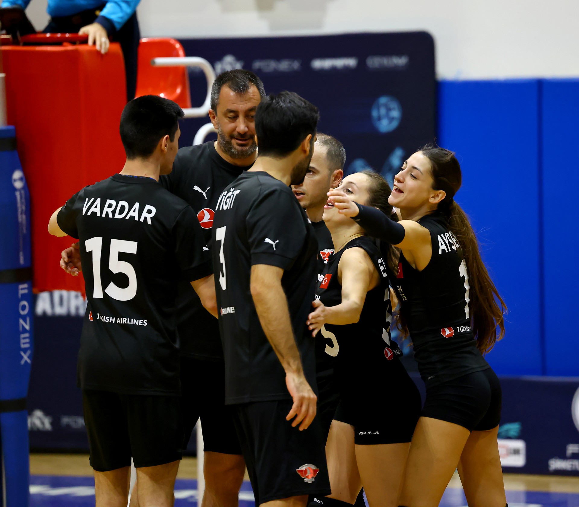 Müsabakanın ilk sayısı Tolga’nın hücumu ile gelirken, ikiden yapılan etkili hücumla Türk Hava Yolları (THY) skoru 2-0 yaptı. Serhat’ın çapraza gönderdiği plase ve THY’nin hücum hatalarıyla skor 5-4’e kadar geldi. Yiğit’in servis serisinde fark dört sayıya çıktı (8-4). Karşılıklı sayılar sürerken fark kapanmadı (12-8). Nurhan’ın servis turunda Denizbank farkı ikiye indirdi (12-10). Ömer’in servis serisinde Tolga ve Ayşe üzerinden üretilen sayılarla THY farkı yeniden açarak skoru 20-11 yaptı. Serhat’ın ace sayısı Denizbank’ı sette tutmaya çalışsa da (22-15), THY üstünlüğünü korudu ve Denizbank’ın servisi fileye takmasıyla ilk seti 25-19 kazandı.