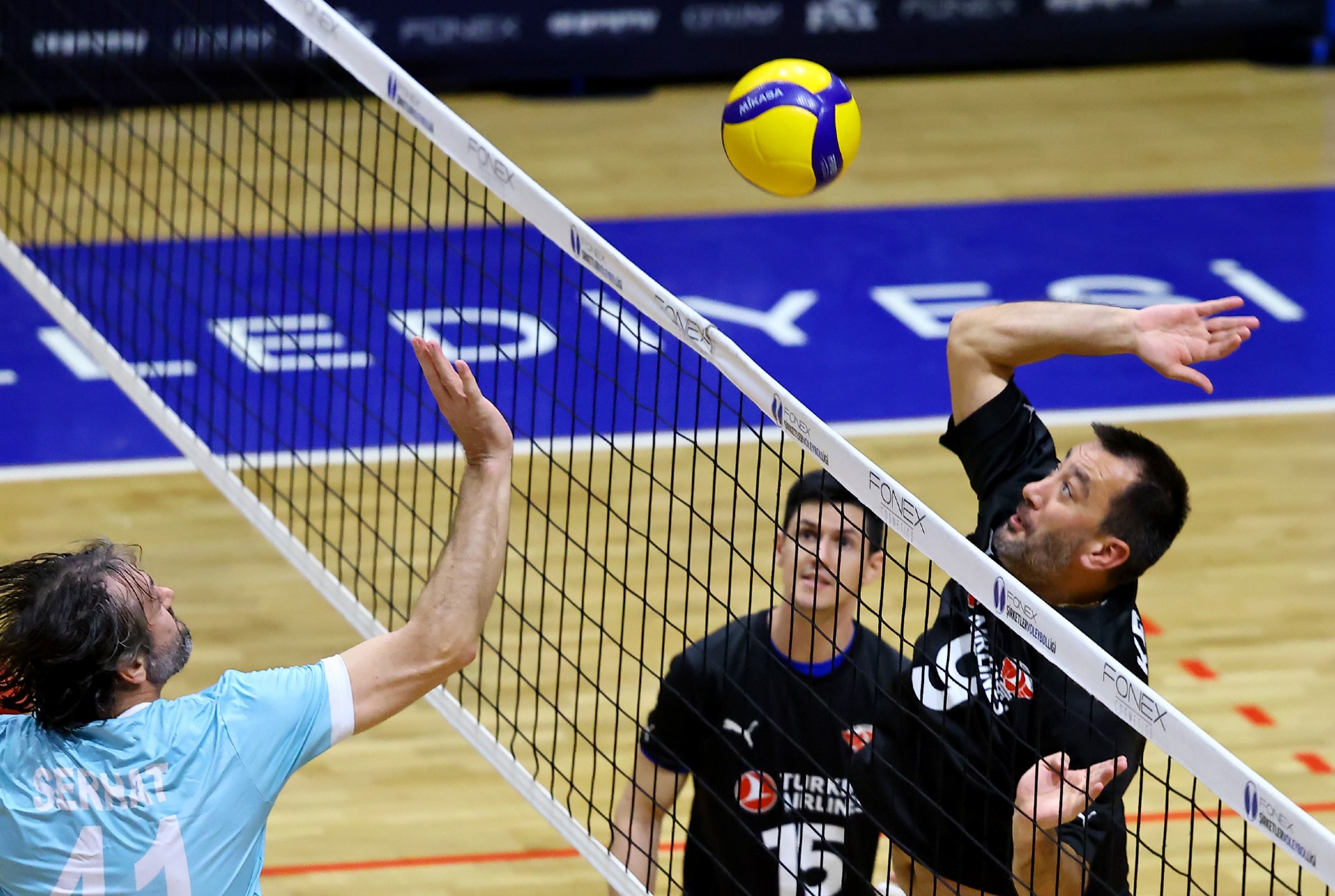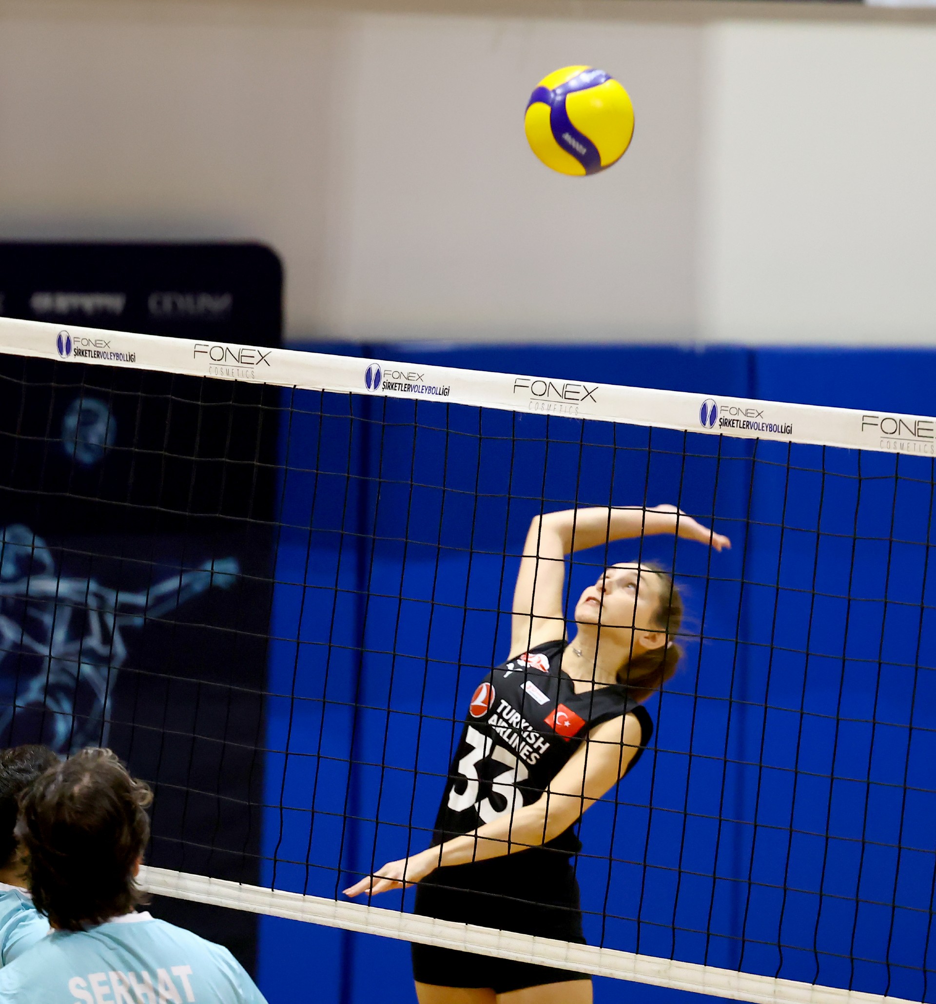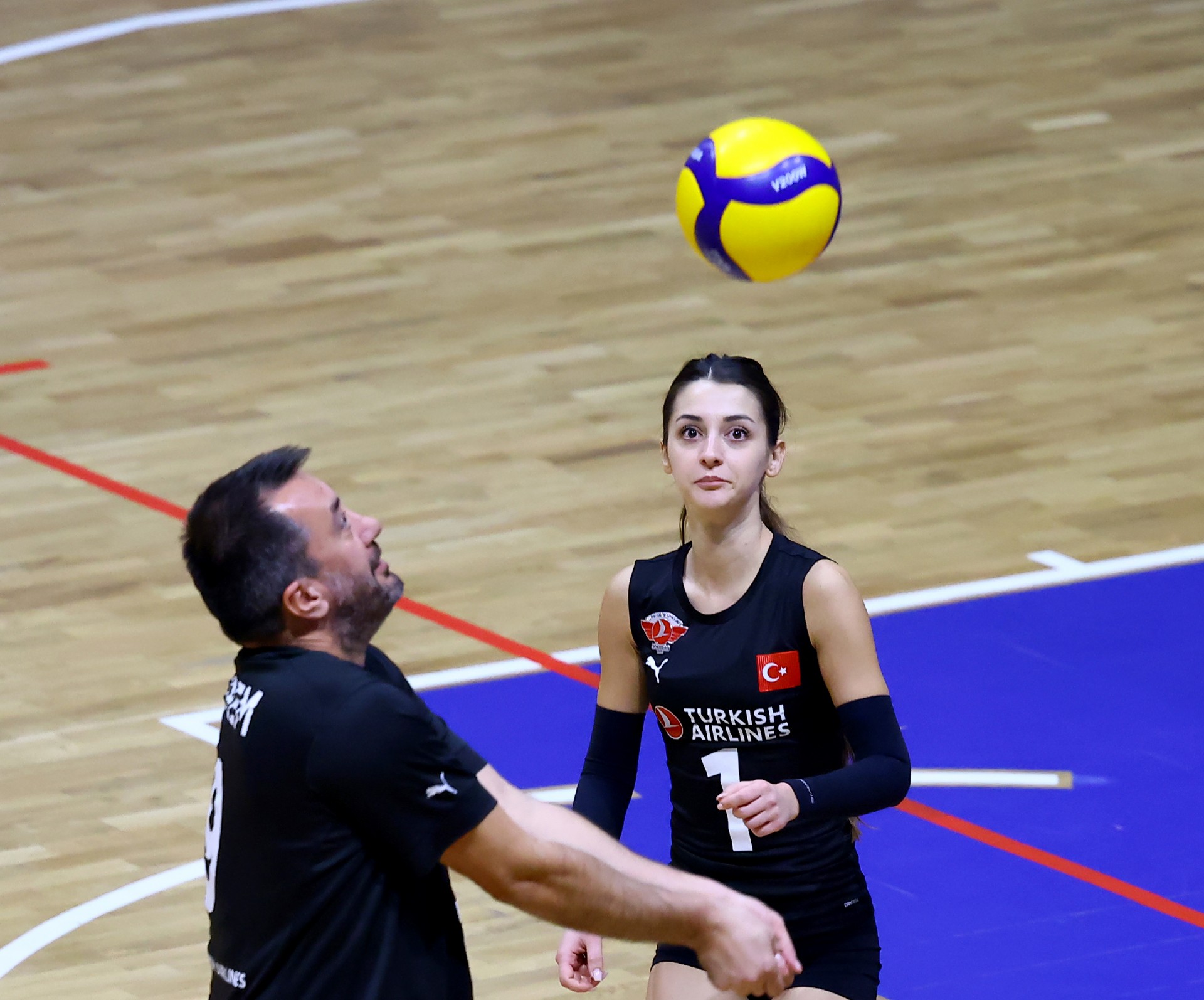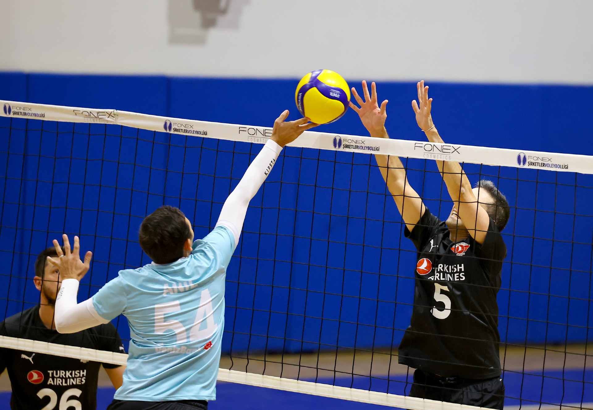 Müsabakanın ilk sayısı Tolga’nın hücumu ile gelirken, ikiden yapılan etkili hücumla Türk Hava Yolları (THY) skoru 2-0 yaptı. Serhat’ın çapraza gönderdiği plase ve THY’nin hücum hatalarıyla skor 5-4’e kadar geldi. Yiğit’in servis serisinde fark dört sayıya çıktı (8-4). Karşılıklı sayılar sürerken fark kapanmadı (12-8). Nurhan’ın servis turunda Denizbank farkı ikiye indirdi (12-10). Ömer’in servis serisinde Tolga ve Ayşe üzerinden üretilen sayılarla THY farkı yeniden açarak skoru 20-11 yaptı. Serhat’ın ace sayısı Denizbank’ı sette tutmaya çalışsa da (22-15), THY üstünlüğünü korudu ve Denizbank’ın servisi fileye takmasıyla ilk seti 25-19 kazandı.